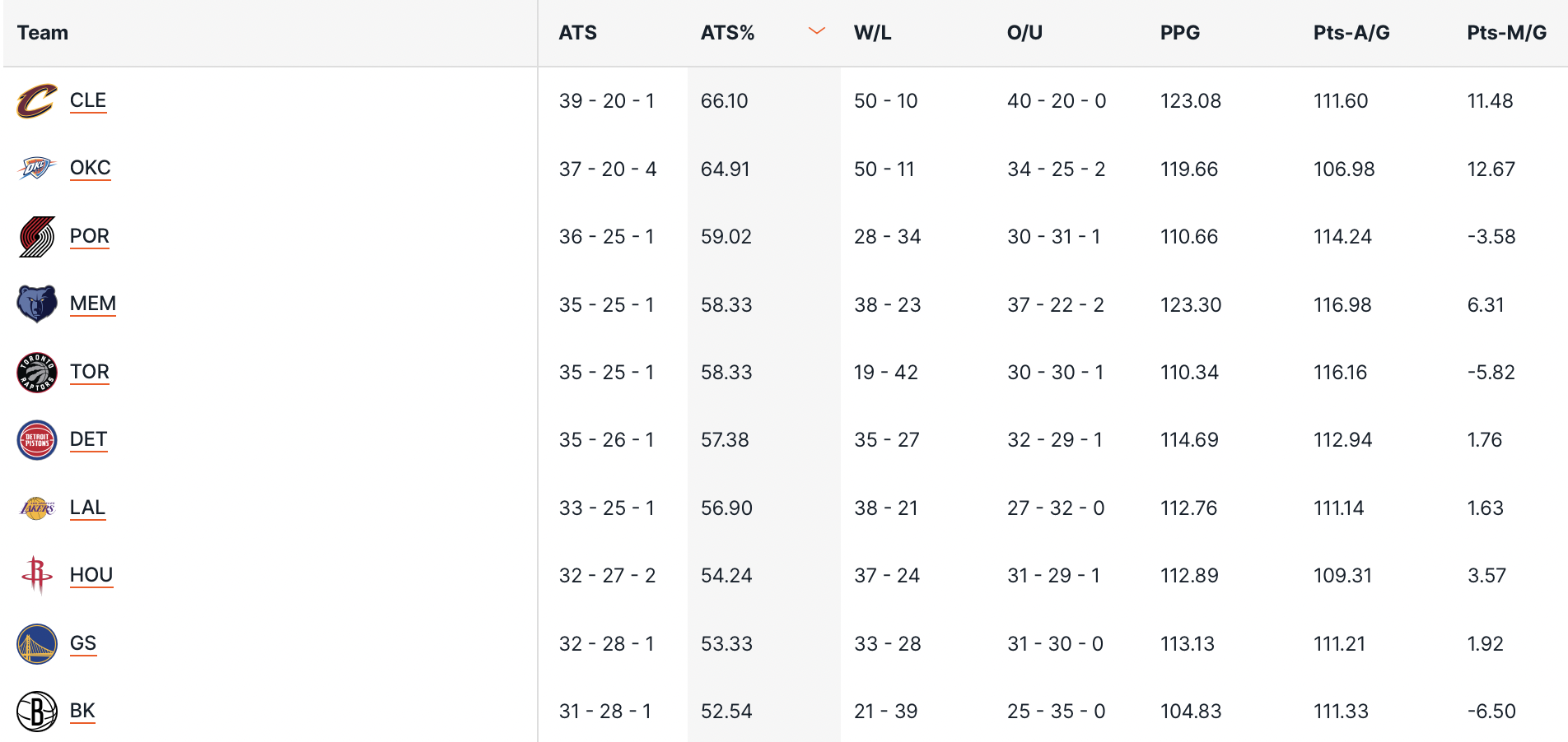 Andiamo a vedere gli aggiornamenti delle statistiche per le migliori squadre su cui puntare, e abbiamo sempre i Cleveland Cavaliers al comando, non solo come prima squadra ad arrivare alle 50 win stagionali, ma anche come migliore nelle scommesse contro gli handicap (ATS) con un 66.1% di linee coperte. Lunedì notte anche gli OKC Thunder sono arrivati alle 50 win, ma sono un pò più indietro come rendimento nelle scommesse col 64.9% di linee coperte. Completano il podio i sorprendenti Portland Trail Blazers col 59%.