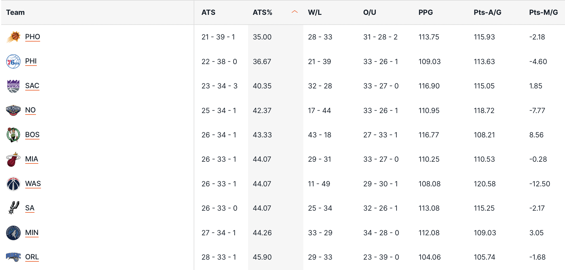 Al contrario i Phoenix Suns continuano a deludere, anche gli scommettitori, col 35% di linee coperte, il peggior rendimento della lega, seguiti dalla delusione a Est, i Philadelphia 76ers al 36.6%, poi i Sacramento Kings completano questo scomodo podio con il 40.3% ATS.