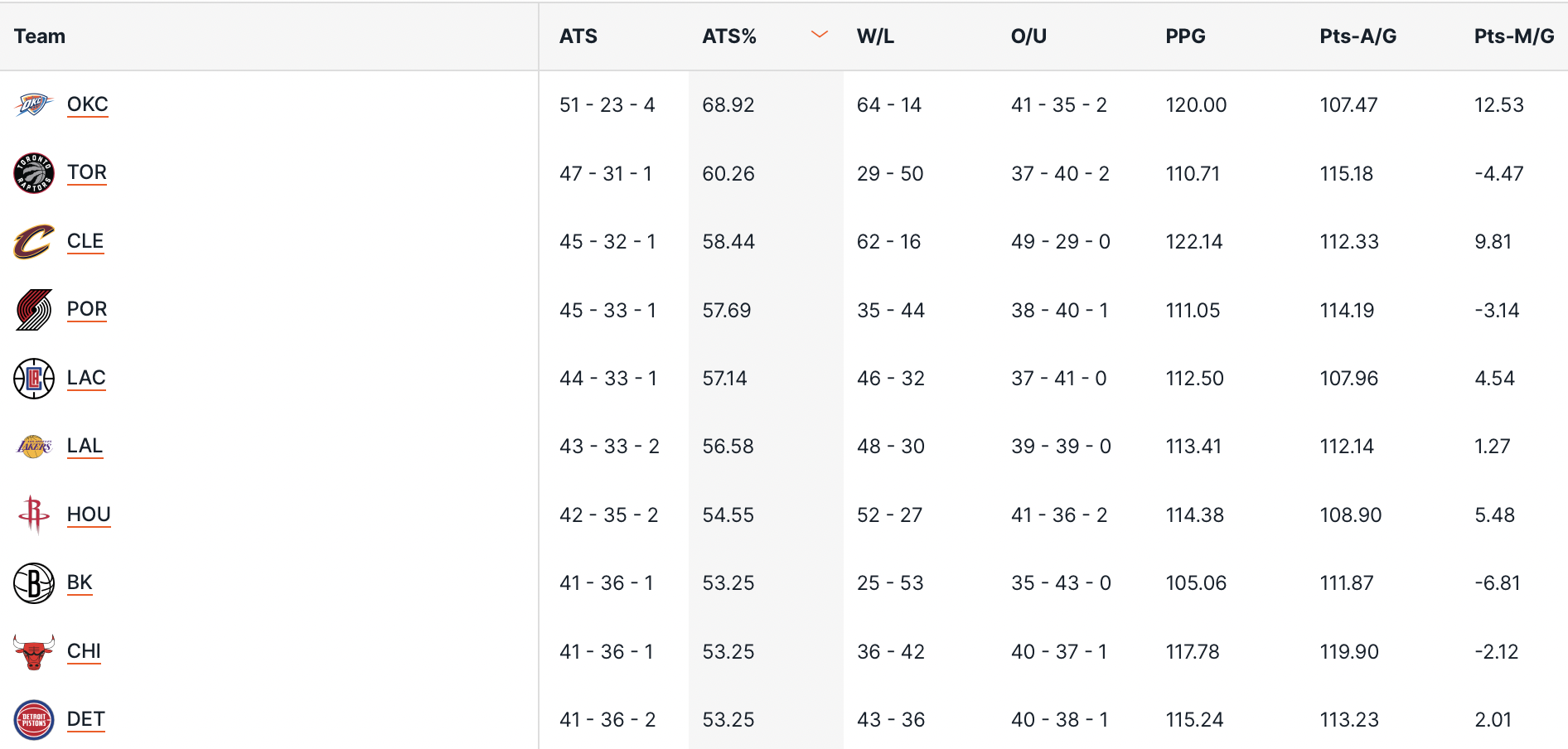 Non cambiano disuna virgola le prime posizioni delle migliori squadre come rendimento nelle scommesse sugli handicap (ATS), con gli OKC Thunder che staccano tutti col 68.9% ATS su Toronto Raptors e Cleveland Cavaliers. I Thunder sono nettamente i migliori anche come margine medio di +12.53 punti a partita, e pure qui abbiamo i Cavs ad inseguire con +9.81 punti.