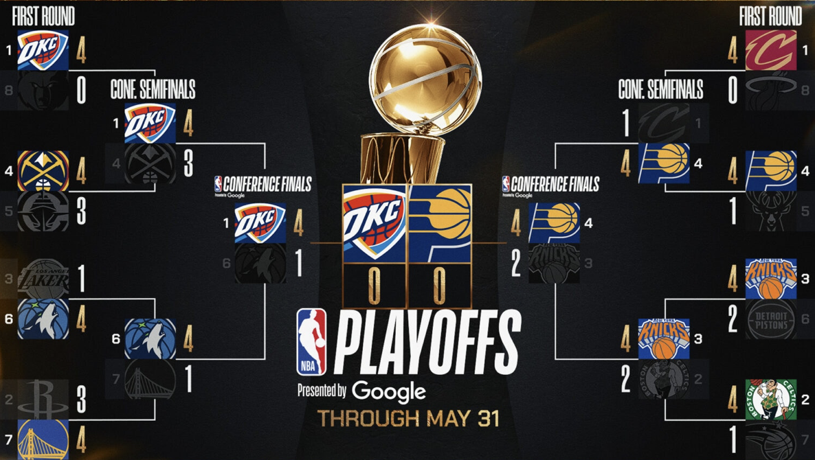 Questo sarà il primo titolo della loro storia per Thunder o Pacers, che sono entrambe alla seconda finale: nel 2012 l’Oklahoma City di Durant, Westbrook e Harden perse 4-1 contro i Miami Heat di James, Wade e Bosh, il primo anello in assoluto per il Re; più indietro, nel 2000, gli Indiana Pacers di Reggie Miller e di coach Larry Bird, perse 4-2 contro i Los Angeles Lakers di Shaq O’Neal, Kobe Bryant e coach Phil Jackson, al primo di tre titoli consecutivi. In verità i Pacers hanno vinto tre titoli in ABA negli anni ’70, la Lega che nacque come alternativa alla NBA e che poi ne fu inglobata. Mentre i Thunder derivano dai Seattle Sonics che un titolo l’hanno vinto, nel 1979.