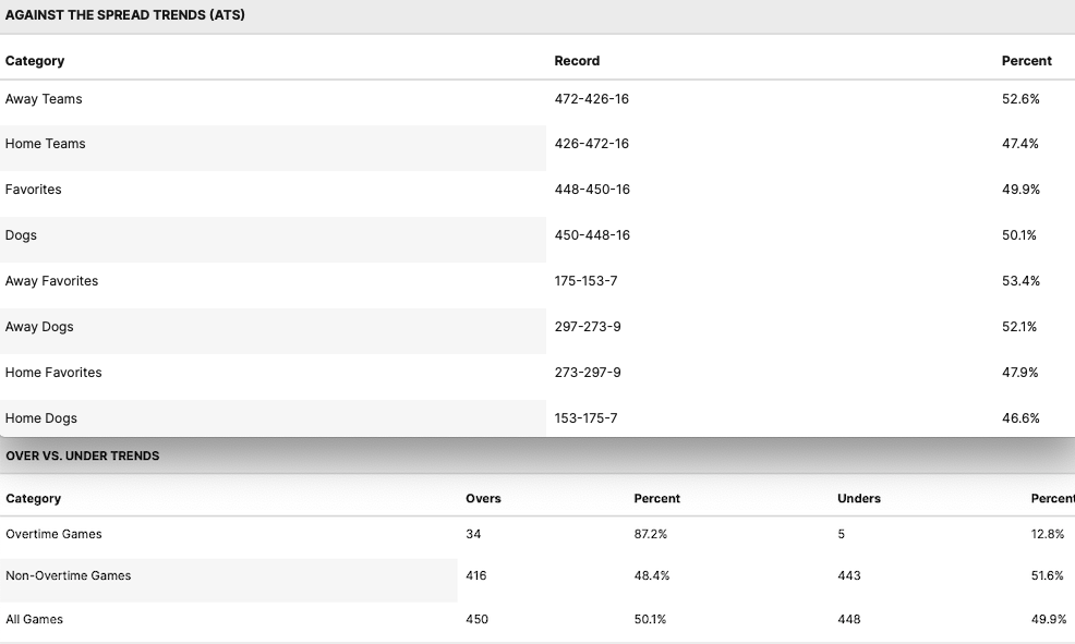La settimana scorsa il trend forte era sulle squadre in trasferta favorite, un dato che in certo senso si conferma anche negli ultimi 7 giorni visto che le squadre in trasferta hanno coperto il 71% delle linee di handicap (22-9 ATS) ma questa volta a spiccare davvero sono gli underdogs in trasferta che portano questa percentuale al 78,6% (11-3 ATS), davvero alta.