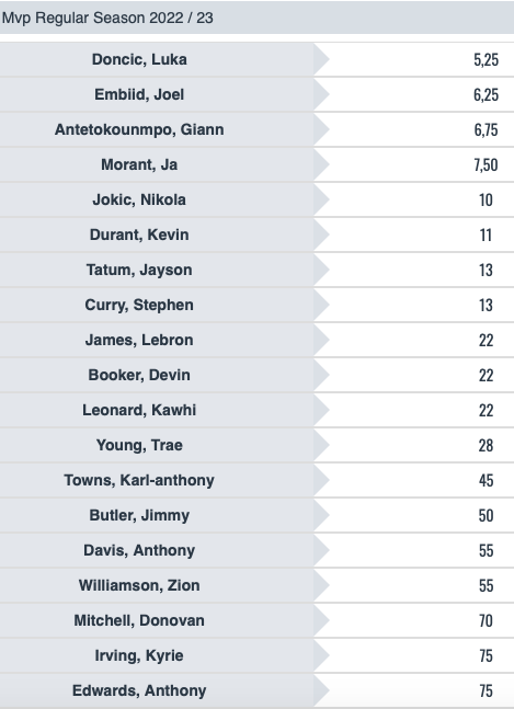 Quote alte per Lebron James, Devin Booker e Kawhi Leonard. James è sempre da considerare in queste scommesse, anche se la sua parabola è in calo (come la situazione generale ai Lakers). Leonard si porta dietro i dubbi legati agli infortuni, ma i Clippers con George e anche con Wall, possono tornare protagonisti nel 2023. Booker è quello che mi convince di più in questo terzetto in quota @22. La stella dei Suns guida una squadra che ormai da qualche stagione è sempre ottima in regular-season.
