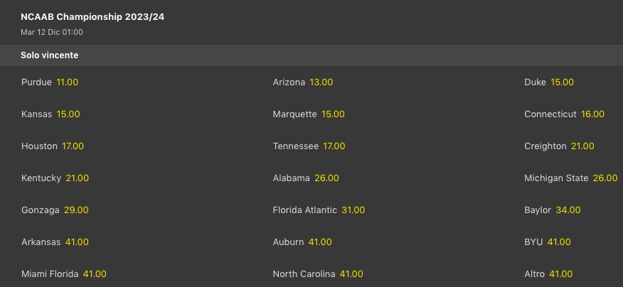 Nonostante qualche passo falso, Purdue mantiene il vertice delle lavagne delle quote antepost per la vittoria finale del titolo stagionale, con i Boilmakers che vedono scendere la quota mentre perde terreno Kansas che passa dalla 1° alla 3° posizione, dietro alla sorprendente Arizona, e pari con Duke e Marquette.