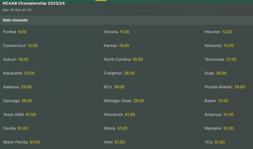 Non è cambiato letteralmente nulla rispetto alla settimana scorsa per quanto riguarda le quote antepost per la vittoria finale del titolo nazionale di NCAAB, con i Purdue Boilmakers sempre al comando sugli Arizona Wildcats che a nostro avviso rimangono troppo alti qui, come i Kansas Jayhawks che si mantengono @15 volte la posta, al pari con Kentucky e davanti ad Auburn, a North Carolina e a Tennesse, tutti programmi che ultimamente ci stanno convincendo maggiormente.