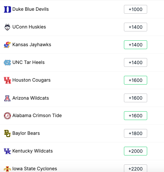 Tra le favorite si ripresentano anche gli Houston Cougars @17 che hanno toccato la #1 del ranking nazionale ma pure loro sono stati deludenti non arrivando alle Final Four (noi avevamo puntato sulla vittoria della loro Division). Alle stesse quote troviamo gli Arizona Wildcats ed anche gli Alabama Crimson Tide che quest’anno sono arrivati alle Final Four per la prima volta.