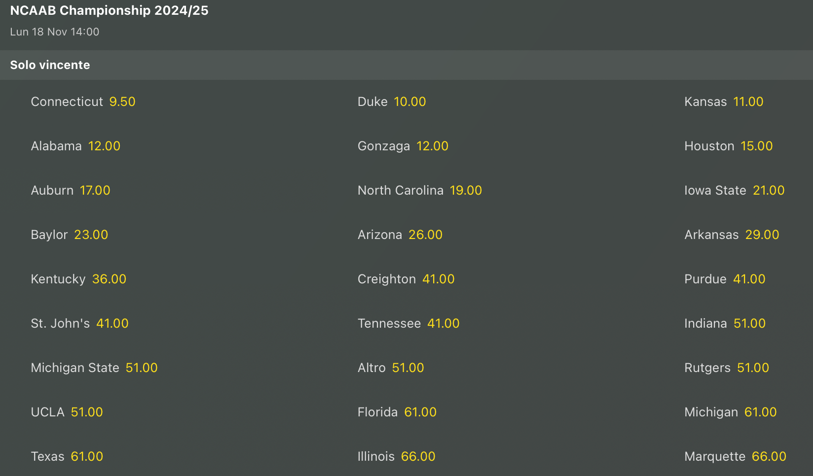 Una sola settimana, con tanti match scontati, non basta a rivoluzionare la lavagna delle quote antepost per la vittoria finale del titolo nazionale di College Basket, e infatti le prime 4 posizioni non cambiano di una virgola, con UConn favorita per il tris consecutivo, su Duke, Kansas ed Alabama. La prima novità è il sorpasso anche qui di Gonzaga su Houston.