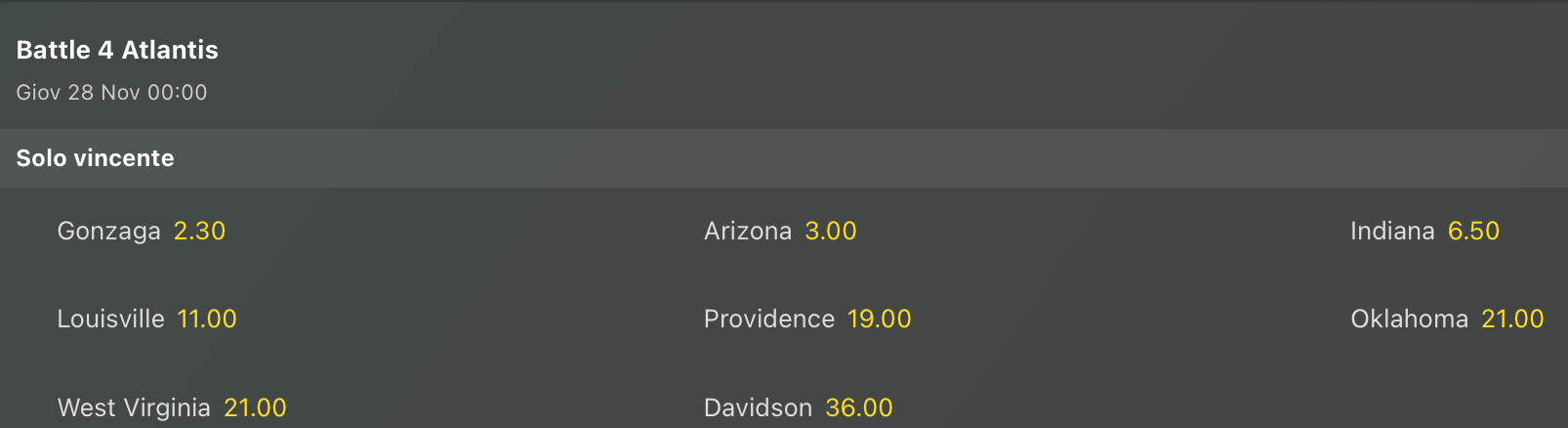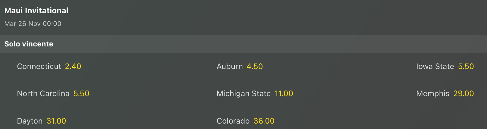In questi giorni iniziano anche i tornei tra top team, una sorta di riscaldamento dove i grandi programmi si sfidano su campo neutro, in piccoli, ma importanti, tornei ad eliminazione. I tornei più grossi sono sempre Maui Invitational e Battle 4 Atlantis, vediamo anche qui le quote antepost per la vittoria finale di questi tornei.