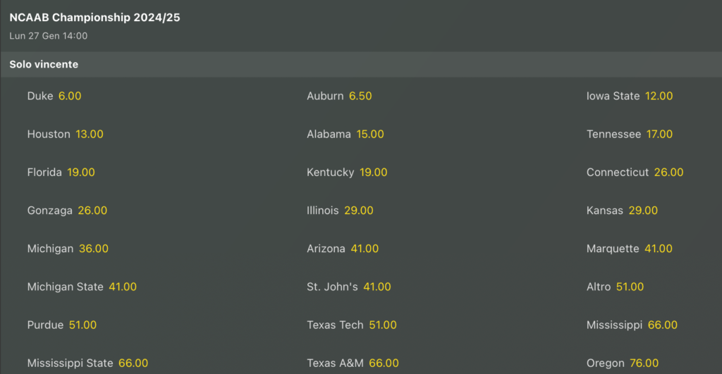 Gli ultimi aggiornamenti delle lavagne per le quote antepost del titolo nazionale di College Basket.