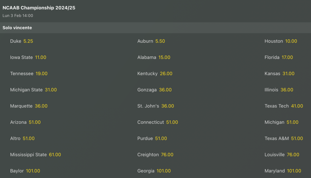 Quote Antepost: gli ultimi aggiornamenti sulle lavagne delle scommesse stagionali NCAAB