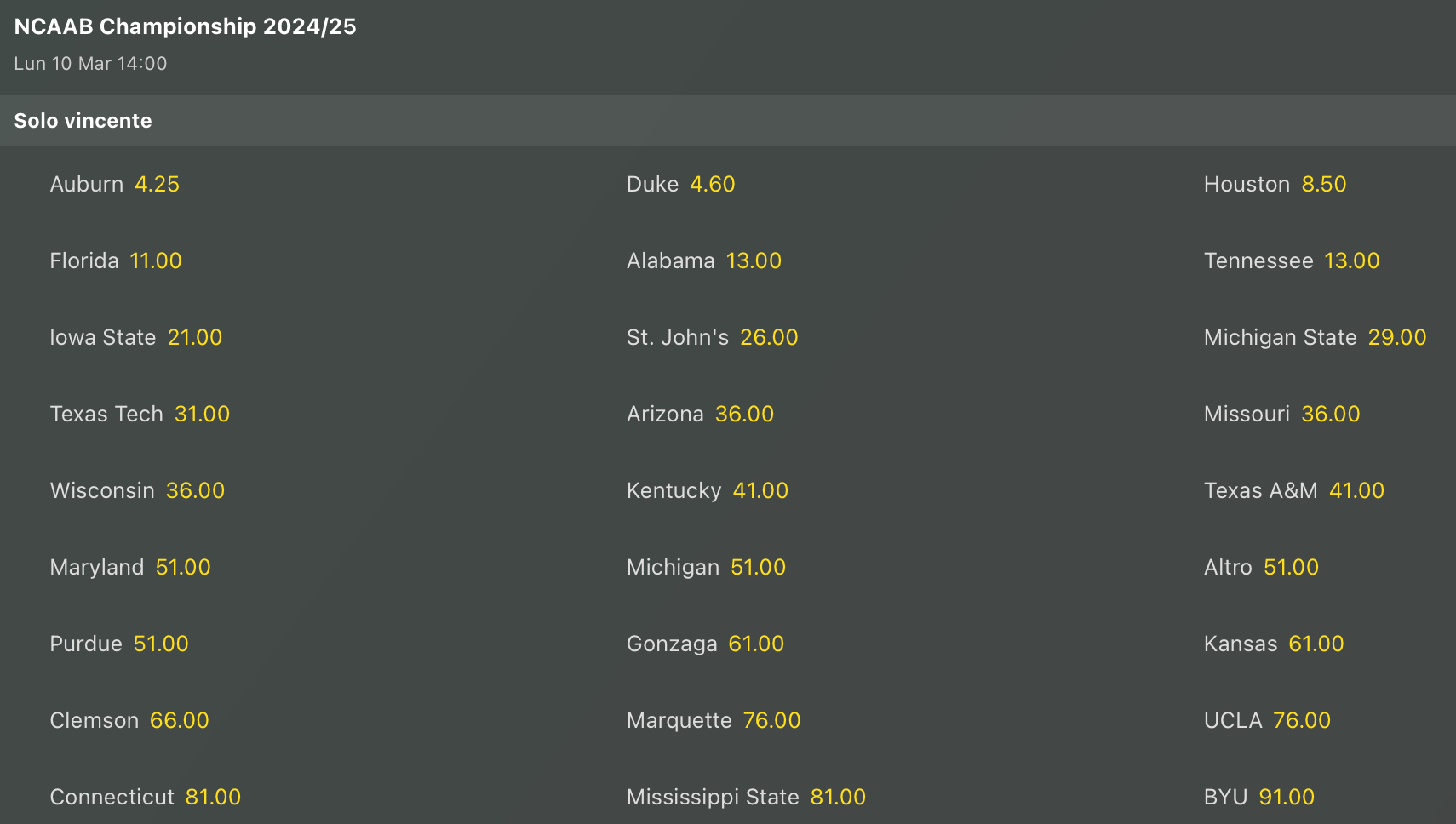 Gli ultimi aggiornamenti delle lavagne per le quote antepost del titolo nazionale di College Basket.