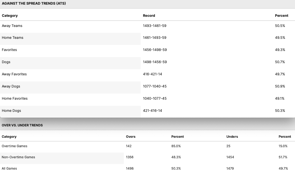 Parallelamente ai pro del NBA (leggi qui) anche nel College l’ultima settimana di partite ha ripagato gli scommettitori che sono andati sulle squadre in trasferta che hanno coperto il 54,7% di linee handicap (ATS). Spaccati invece i dati su O/U praticamente in equilibrio negli ultimi 7 giorni (180 partite da Over e 176 da Under), del resto non si segnalano trend importanti anche nelle statistiche complessive stagionali che trovate qui sotto.