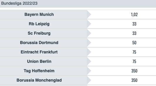 Quote Bundesliga 17 novembre 2022, calano Union Berlino e Borussia Dortmund, il Friburgo ci prova a tenere il passo ma il Bayerrn Monaco ha sempre una marcia in più nel campionato di calcio in Germania che domina anche secondo le quote dei bookmakers quando siamo alla pausa mondiale.