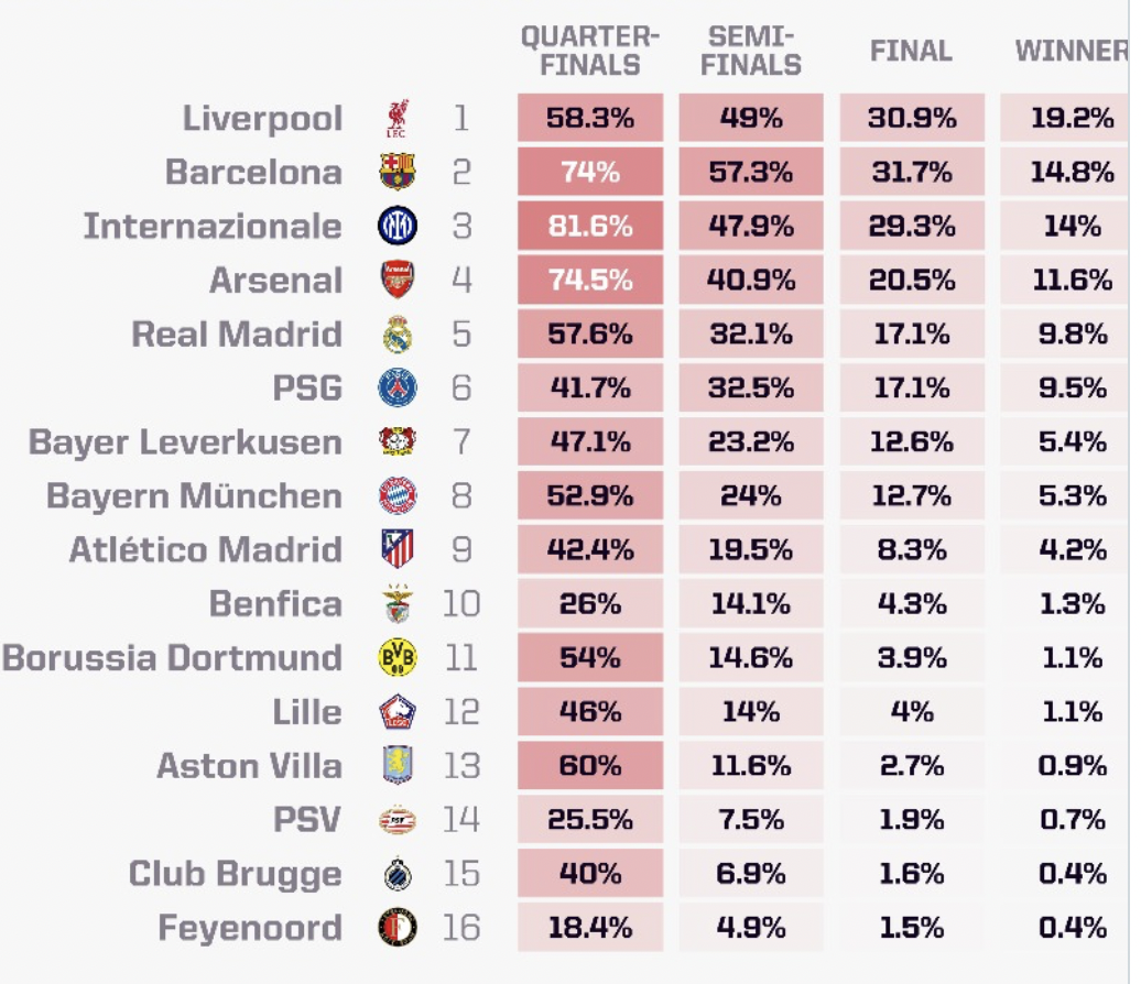 Il super computer OPTA invece per la vittoria finale favorisce il Liverpool che ha dominato la prima fase a girone unico. I Reds hanno un 19.2% di possibilità di portarsi a casa la coppa dalle grandi orecchie, e anche qui i principali avversari sono i blaugrana del Barcellona al 14.8%, ma poi arriva subito l’Inter al 14%, superiore anche rispetto al 9.8% di possibilità del Real. I bookmakers stanno quindi sbagliando le stime? O si sta sbagliando il super cervellone statistico di OPTA?