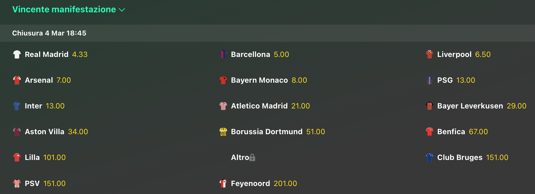 I nerazzurri hanno un corposo 29.3% di possibilità di raggiungere la finale, dietro solo al Barcellona (31.7%) e al Liverpool (30.9%), ma davanti ad altre big come Arsenal (20.5%), PSG (17.1%) e soprattutto Real Madrid (17.1%) che però, come vedremo più tardi, è sempre favorita per la vittoria finale secondo i bookmakers.