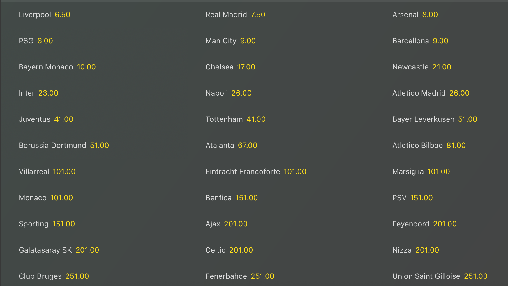 Sono della sfida anche l’Arsenal @8 e il bis del PSG che si gioca alla stessa quota, di poco avanti su Barcellona e Manchester City che si giocano entrambe @9 volte la posta. In doppia cifra apre il Bayern Monaco @10 mentre con le inglesi Chelsea @17 e Newcastle @21 si apre la seconda fascia di favorite per la vittoria finale.