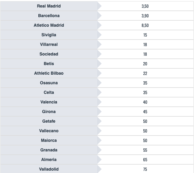 Vediamo il programma completo del primo turno di Coppa del Re, con tante partite tra martedì e giovedì. A seguire le quote antepost per la vittoria finale, e anche qui è un testa a testa classico tra Real Madrid e Barcellona, con l’Atletico Madrid più staccato ma pronto ad inserirsi.