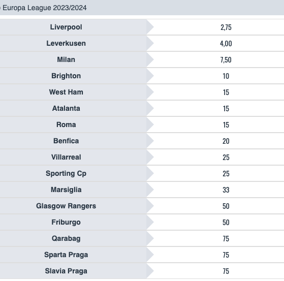 Le quote antepost favoriscono nettamente il Liverpool sul Bayer Leverkusen per la vittoria finale, col Milan prima delle italiane @7.50 volte la posta. Più indietro Atalanta e Roma che hanno esattamente la quota al doppio rispetto ai rossoneri.