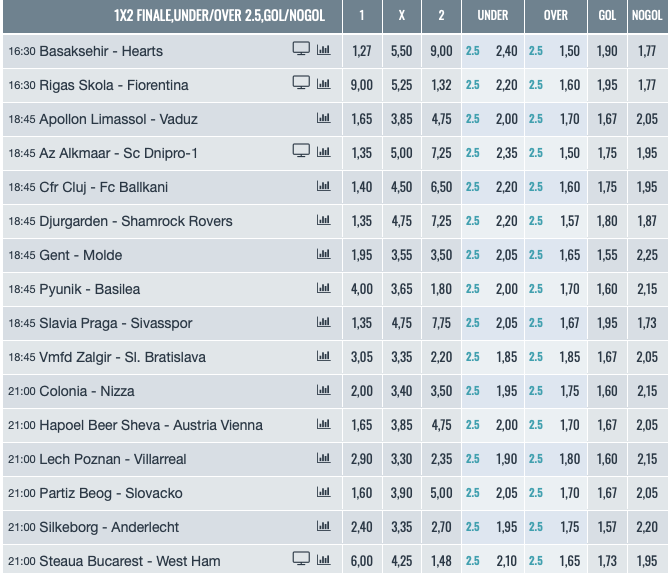 Nel Gruppo E, AZ Alkmaar-Dnipro si giocano in Olanda il primo posto nel girone (gli olandesi hanno 2 risultati su 3 in virtù del vantaggio di 2 punti). Nell’altra gara del gruppo si affrontano Apollon-Vaduz senza più alcuna chance di raggiungere chi li precede.