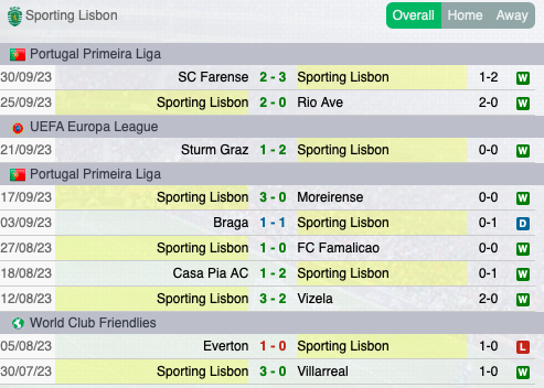 Lo Sporting Lisbona è primo a vele spiegate nel campionato portoghese con 6 vittorie ed un pareggio. E’ ancora imbattuto in questa stagione, visto che la gara inaugurale del girone l’ha vinta in casa dello Sturm Graz per 2-1. Nei precedenti contro squadre italiane non perde in casa dal lontano agosto 2005 per 0-1 contro l’Udinese. Da quel momento 2 vittorie e 4 pareggi contro squadre italiane.