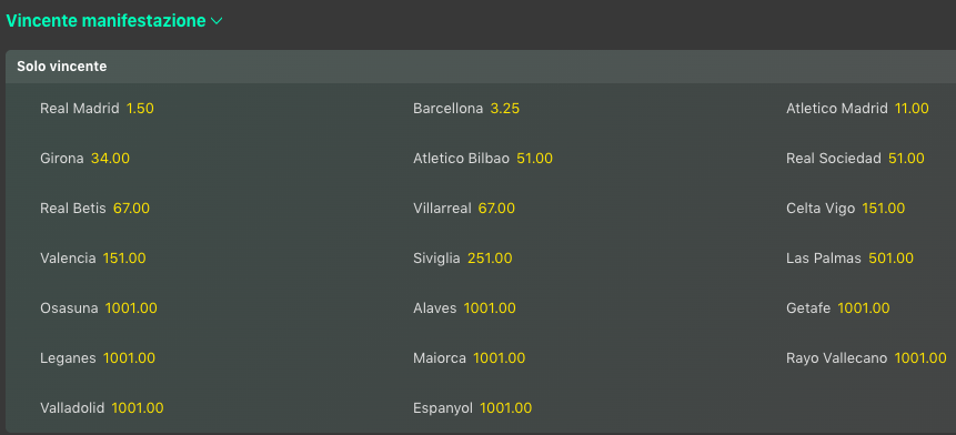 Nonostante la grande partenza dei Blaugrana, il Barcellona @3.25 rimane dietro al Real Madrid @1.50 nelle quote antepost per la vittoria finale della Liga spagnola dove si preannuncia un classico testa a testa tra le due big del calcio iberico, con l’Atletico Madrid staccato @11 volte la posta e la sorpresa dello scorso anno, il Girona, che si gioca @34 di quota.