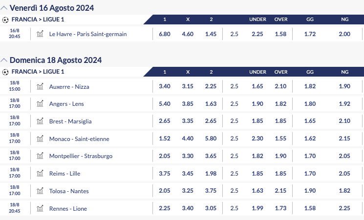 Tornando alle quote per il titolo, la principale avversaria del PSG (comunque a debita distanza) è il Marsiglia, tallonata da Monaco, Lilla e Lens. In seconda fascia Lione e Nizza. A seguire vediamo anche le principali quote 1X2, Gol e Over-Under sui match della prima giornata del campionato di calcio transalpino.