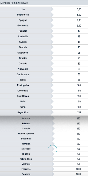 Vediamo la comparazione delle migliori quote antepost sul mercato italiano per la vittoria finale di questa manifestazione, con gli Stati Uniti grandi favoriti per la vittoria finale @3.25, sulle inglesi staccate @5.50. Molto lontane le azzurre con l’impresa dell’Italia vincente che si gioca @75.00 volte la posta. A seguire tutte le quote antepost di SNAI.