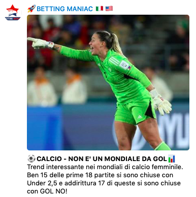 Trend incredibile, ne abbiamo parlato anche ieri nel canale Telegram. In questo mondiale di calcio femminile chi sta giocando su Gol NO sta facendo tanti soldi. Dopo l’ultimo aggiornamento siamo arriva a 19 Gol NO su 20 partite. Solo un match si è chiuso con entrambe le squadre a segno finora!