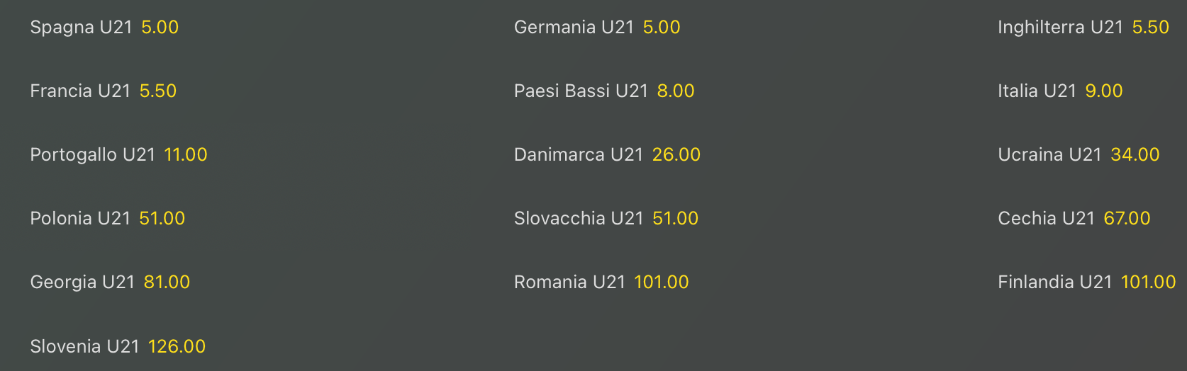 Andiamo a vedere la lavagna delle quote antepost per la vittoria finale degli Europei di calcio Under 21 dove i giovani talenti della Spagna in quota @5.00, al pari con la Germania, ma sono molto vicine anche Inghilterra e Francia @5.50 mentre si staccano leggermente Olanda @8 e la nostra Italia @9. Col Portogallo si sale in doppia cifra @11 volte la posta.