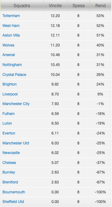 Il campionato inglese rimane un campionato da Over 2.5 (uscito nel 61.25% delle partite) e da Gol SI (60%) mentre tra le singole squadre la formazione migliore per gli scommettitori è il Tottenham con una resa del 53%, di poco avanti a West Ham (52%) ed Aston Villa (51%). In pratica se avessimo puntato €1 sulla vittoria degli Spurs in ogni giornata da inizio campionato, oggi ne avremmo €12.20 (+€4.20) nel conto. Bournemouth e Sheffield Utd ancora a caccia della prima vittoria.