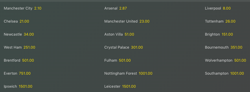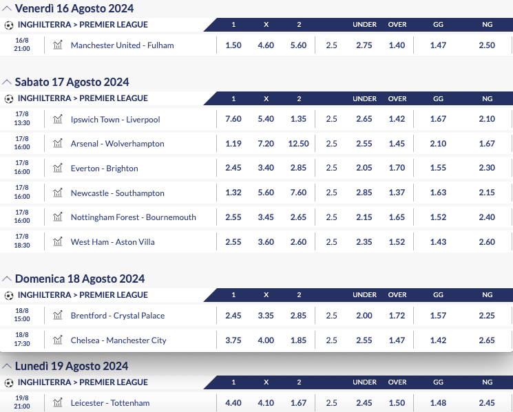 Ecco le quote principali (1X2, Gol e Over-Under) sui match in programma per la prima giornata di Premier League 2024-25 e a seguire le quote antepost. Abbiamo detto del Manchester City davanti a tutti, con la squadra di Guardiola che apre al comando anche nelle lavagne per la prossima Champions League, per capire il potenziale di questa squadra che stacca di poco l’Arsenal, con i Gunners che lo scorso anno ci hanno creduto.