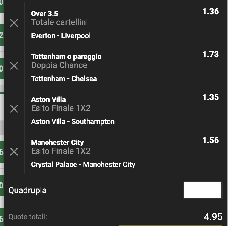Per questo turno del campionato di calcio inglese, senza free pick singola di Morfeo, andiamo comunque con una multipla quota @4.95 su quattro match. Iniziamo con almeno 4 cartellini nel derby di Liverpool e poi le vittorie di Aston Villa e City e anche la doppia chance interna sugli Spurs nel big match, il derby londinese contro il Chelsea.