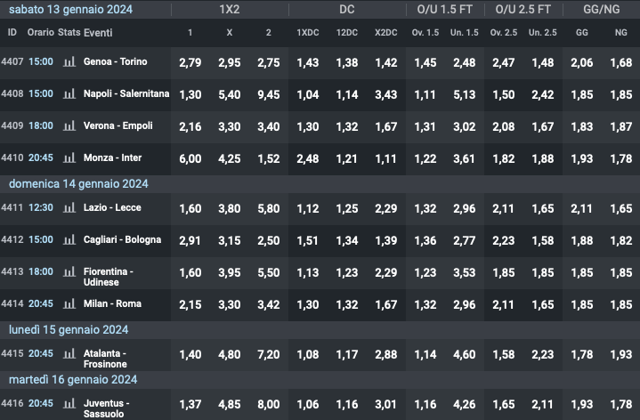 Vediamo le prime quote e le prime preferenze nelle scommesse sulla 20° giornata di Serie A in campo da sabato 13 gennaio con 4 partite, una giornata chiusa dal derby lombardo tra Monza-Inter, con i nerazzurri offerti @1.52 di quota e appoggiati dal 62% degli scommettitori, anche se sarà una trasferta non così semplice.