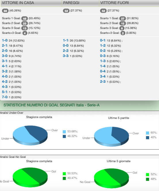 Nell’ultimo turno di campionato abbiamo visto ben 7 partite da Gol/Gol e anche 6 Over, quindi è stato un turno con molte reti. Solo 3 vittorie per le squadre di casa invece, con 4 affermazioni in trasferta e 3 pareggi. Vediamo ora l’aggiornamento dei principali trend di questo campionato di Serie A.