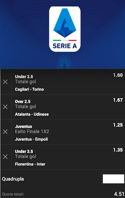 Per questa settimana abbiamo scelto 4 partite del campionato di calcio italiano per una multipla quota @4.51.