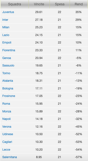 L’Inter è al comando in classicica, ma a livello betting, nei rendimenti sulle scommesse è la Juventus la migliore con un +35%. Se avessimo giocato 1€ sulla Juve vincente ogni partita di questo campionato, ne avremmo vinti €29.61. L’Inter è dietro coni un 29% di rendimento (e una partita in meno). Sempre sul fondo la Salernitana che avrebbe eroso il 54% del bankroll di chi avrebbe avuto la brutta idea (e la testardaggine) di giocare ogni turno sulla vittoria dei campani.