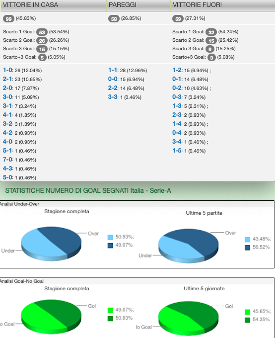 Nell’ultimo turno hanno dominato i Pareggi, ben 4, con 3 vittorie per le squadre di casa e altrettante per le vittorie in trasferta. Nella 21° giornata abbiamo visto 4 partite da Over e 6 da Under, mentre con i Gol Si vediamo invertiti i risultati con 6 Gol/Gol e 4 Gol/No. Ecco il riassunto dei trend stagionali sul campionato di calcio italiano: