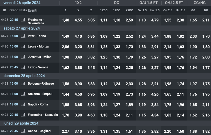 Dal 26 al 28 aprile si gioca una 34° giornata di Serie A aperta dall’anticipo salvezza tra Frosinone-Salernitana. Al sabato altre 4 partite, con Inter-Torino e Lecce-Monza ad aprire, ma l’attesa è per Juventus-Milan. Un altro big match che attende i rossoneri che sono sfavoriti in quota @3.82 per questa trasferta a Torino, con i bianconeri favoriti sotto @2 volte la posta (Pareggio, che non è da escludere, @3.40). Su Planetwin365 i primi scommettitori stanno andando nettamente sulla vittoria Juve (48%) rispetto a quella del Milan (25%). In serata la giornata sarà chiusa da Lazio-Verona.