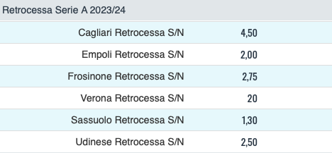 Ecco il riassunto delle quote antepost per la retrocessione: