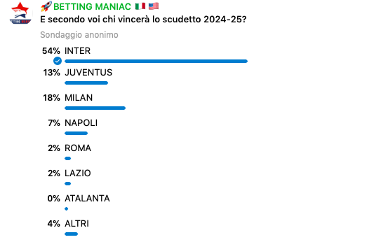 I nostri utenti non sembrano avere dubbi visto che abbiamo chiesto anche a loro, con un sondaggio su Telegram, chi vincerà lo scudetto, ed è stato quasi un plebiscito per l’Inter al 54%, col Milan al 18% principale avversaria, ma molto staccata. I rossoneri sono comunque davanti alla Juventus nonostante un avvio con Fonseca poco convincente, ma siamo solo all’inizio.