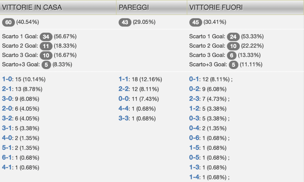 La Lazio, che ospita l’Inter la prossima settimana, è ancora imbattuta in casa (6-1-0) mentre ci sono ancora due formazioni che non hanno ancora vinto sul proprio campo: Monza (0-3-5) e Genoa (0-6-3). La Roma invece rimane ancora a secco in trasferta (0-4-3) anche se la formazione peggiore fuori casa è il Venezia che è 0-2-6 lontano dalla laguna.