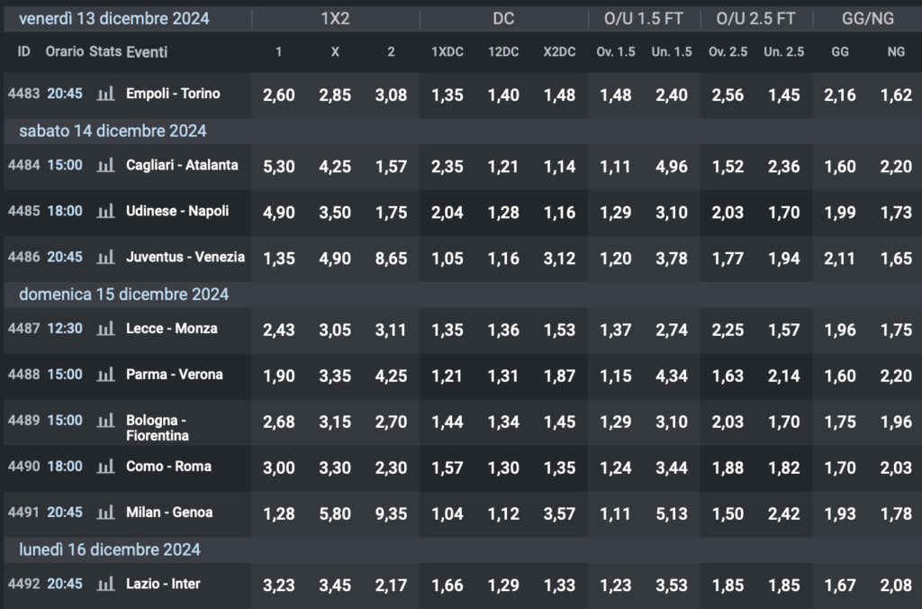 Si torna in campo per la 16° giornata di Serie A da venerdì 13 dicembre con l’anticipo Empoli-Torino. Al sabato altre 3 partite, si inizia con Cagliari-Atalanta, e la Dea nettamente favorita anche in trasferta @1.57, per un altro successo. Anche in Udinese-Napoli gli ospiti sono favoriti @1.75, ma gli uomini di Conte rischiano qualcosa in più in Friuli. Infine alla sera Juventus-Venezia, con i bianconeri che non possono sbagliare e sono tra i maggiori favoriti di giornata @1.35 di quota,