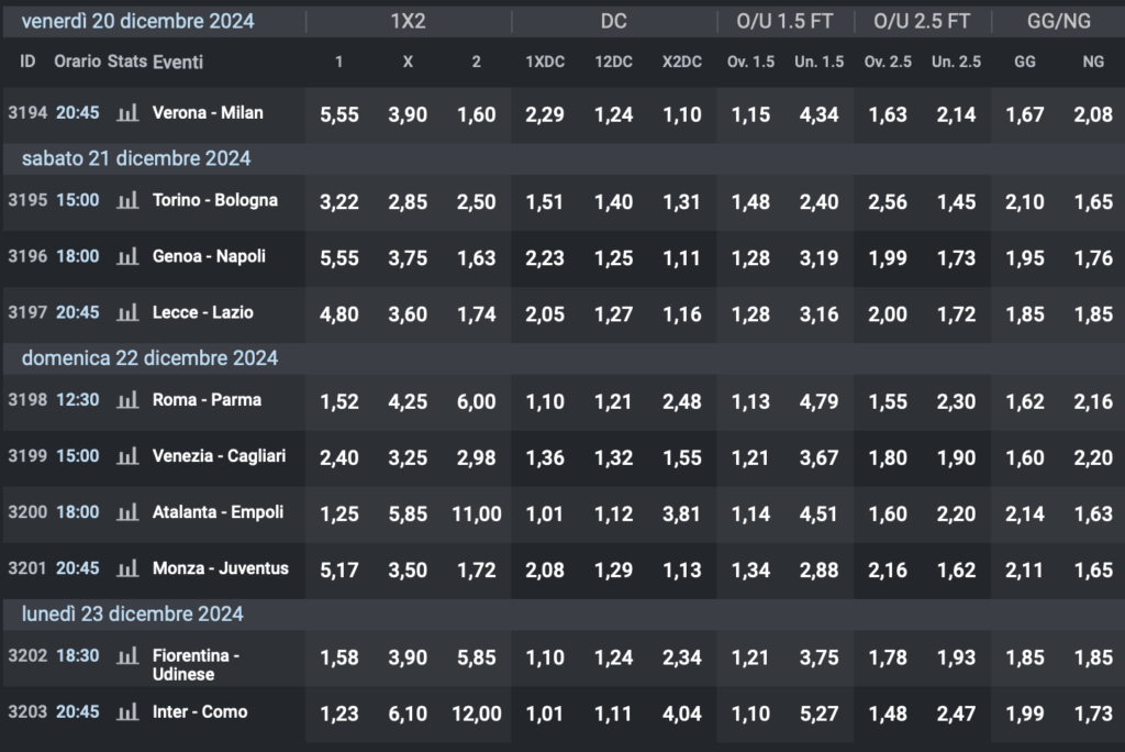Andiamo a vedere gli ultimi aggiornamenti dal campionato di calcio italiano, dopo il posticipo del lunedì che ha visto l’Inter dilagare 6-0 in casa della Lazio, con la squadra di Inzaghi sempre favorita dalle quote antepost. Vediamo anche il prossimo turno prima di Natale che non ci regala nemmeno un vero e proprio big match. Risultati Serie A giornata 16.