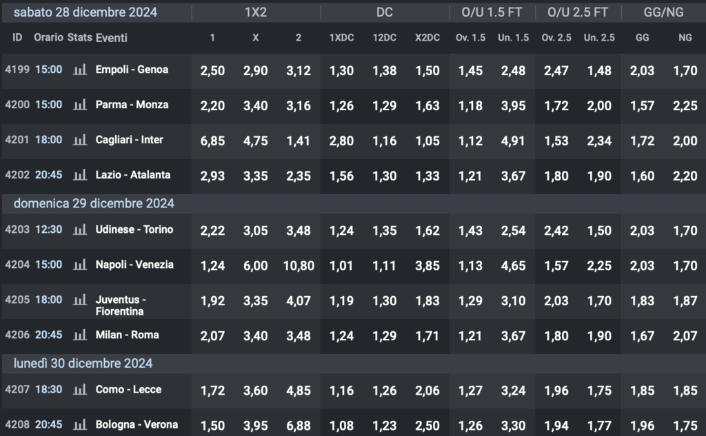 Prossimo turno: 18° giornata con Lazio-Atalanta, Juve-Fiorentina e Milan-Roma