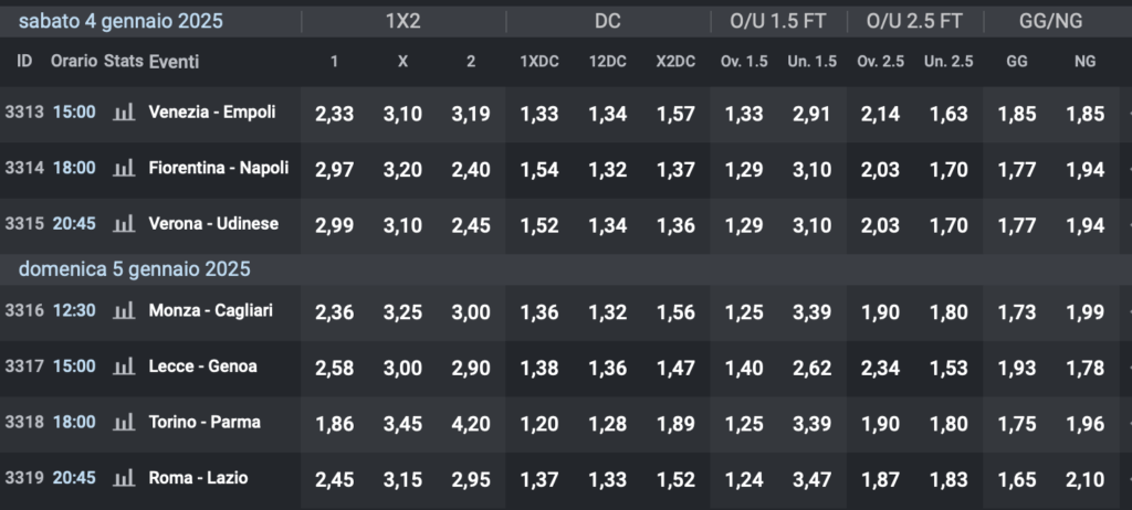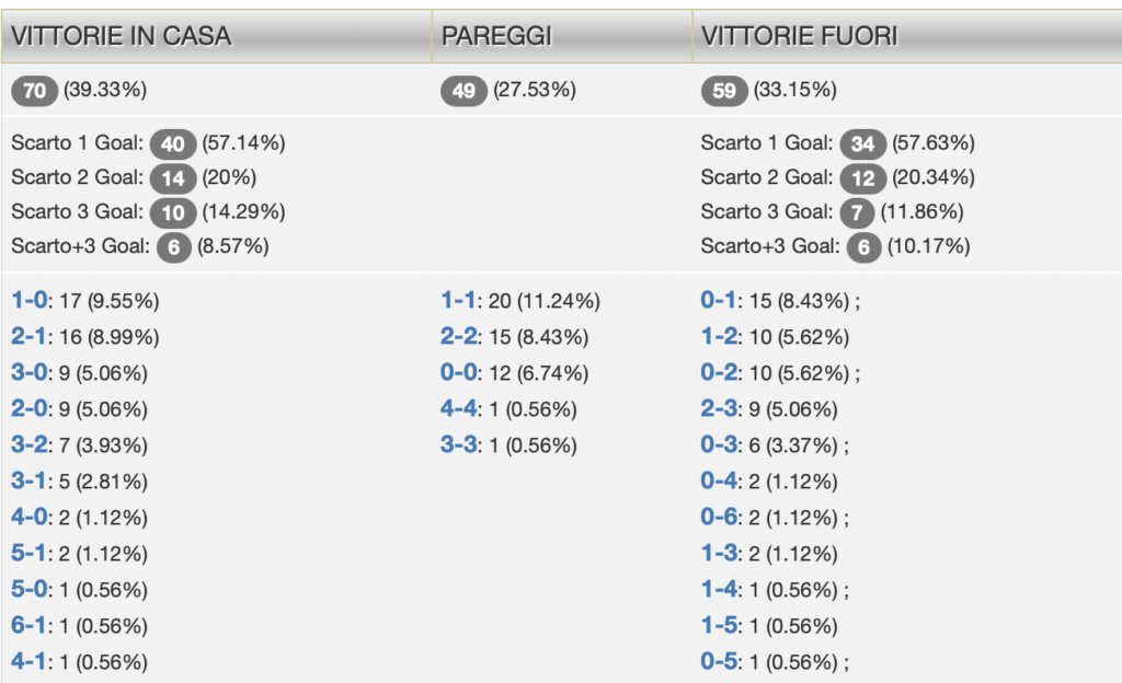 Se parliamo di scommesse Over-Under e singole squadre, sono Verona e Lazio le migliori squadre da alti punteggi, entrambe con O/U 14-4, anche se nelle partite dell’Hellas vediamo più reti totali complessive (3.7) rispetto ai biancocelesti (3.2). Continua a salire il Parma in una lunga striscia di Over, ora i Ducali sono O/U 13-5 con 3.3 gol di media a partita con gli emiliani in campo. Atalanta a due velocità, sempre Under nelle ultime 3 trasferte ma sempre Over nelle ultime 3 in casa a Bergamo. La miglior squadra da Under in assoluto rimane l’Empoli che però ha segnato 4 Over nelle ultime 5 giornate, ed è arrivato a O/U 7-11, agganciando Lecce, Torino (che ha interrotto una lunga striscia di Under) e Como (4 Under nelle ultime 5 giornate).