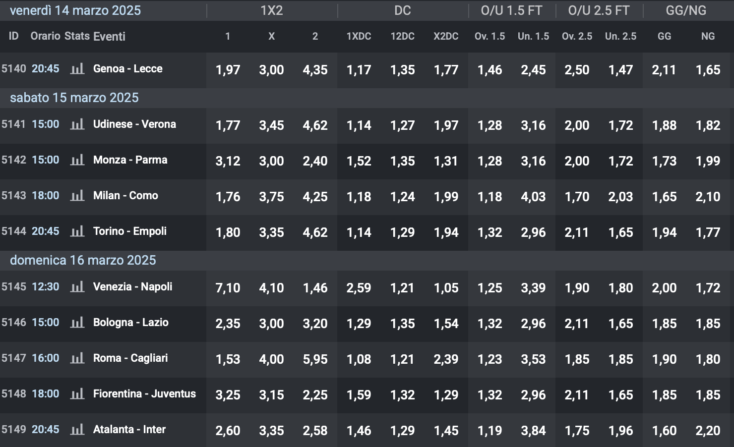 Andiamo a vedere la 29° giornata di Serie A con le prime quote e le prime percentuali di puntate degli scommettitori di Planetwin365. Si inizia con l’anticipo di venerdì 14 marzo con Genoa-Lecce. Si continua con 4 partite al sabato e alle 18:00 in Milan-Como i rossoneri non possono sbagliare, anche se sono quotati @1.76 in casa a San Siro contro il Como offerto @4.25. Il 53% delle prime puntate vanno sul Milan vincente, ma un 22% crede nel colpo in esterna dei comaschi. In serata Torino-Empoli con i granata favoriti @1.80.