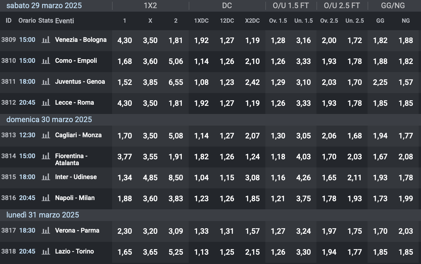Il turno si chiuderà con un doppio posticipo del lunedì. Alle ore 18:30 sfida salvezza con Verona-Parma, e l’helle favorita in quota @2.30 (41%), contro il @3.09 dei Ducali (30%) e alle 20:45 si chiude all’Olimpico con Lazio-Torino. I biancocelesti sono favoriti @1.65 (57%) contro i granata @5.25 (18%).