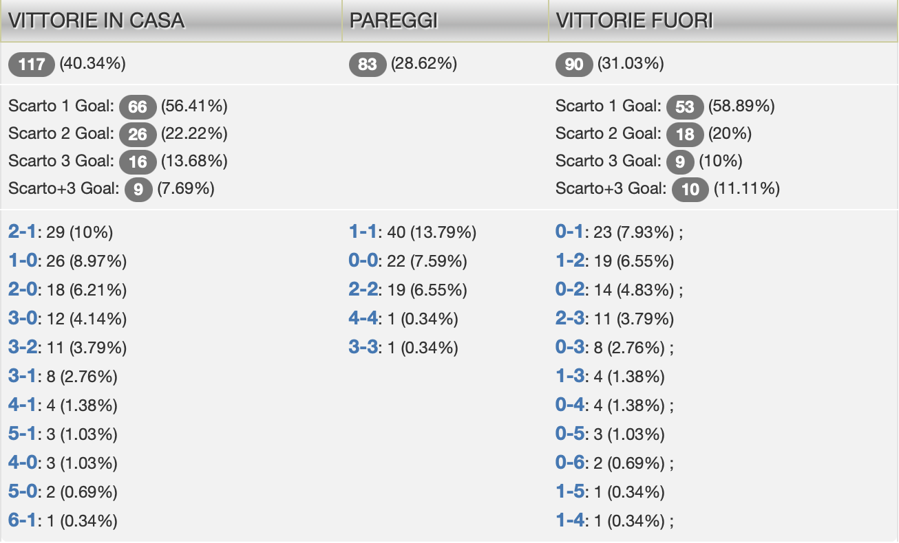 Tra le singole squadre la Lazio è la miglior da Over con O/U 21-8 e 3.1 gol totali segnati di media nelle partite dei biancocelesti, con al 2° posto l’Inter con O/U 17-12 e 3.2 gol totali di media, anche se i nerazzurri hanno segnato 4 Under nelle ultime 5 partite. La miglior squadra da bassi punteggi torna ad essere il Torno (O/U 10-19 con 2.3 gol totali di media), dopo il 2-1 del Genoa che domenica ha interrotto una lunga striscia di Under e ora è O/U 11-18 (2.2 gol totali di media, il dato più basso assieme alle partite del Venezia).