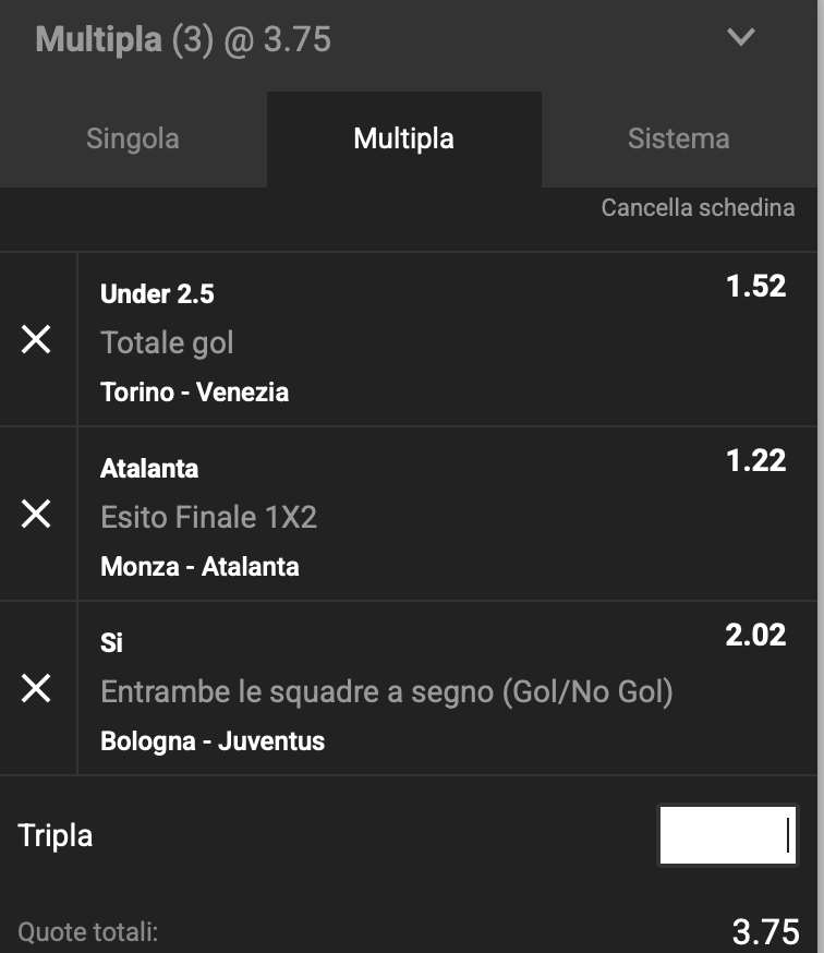 Questa settimana abbiamo trovato solo 3 quote discrete per questo turno di Serie A, per una piccola multipla, una tripletta @3.75 di quota.