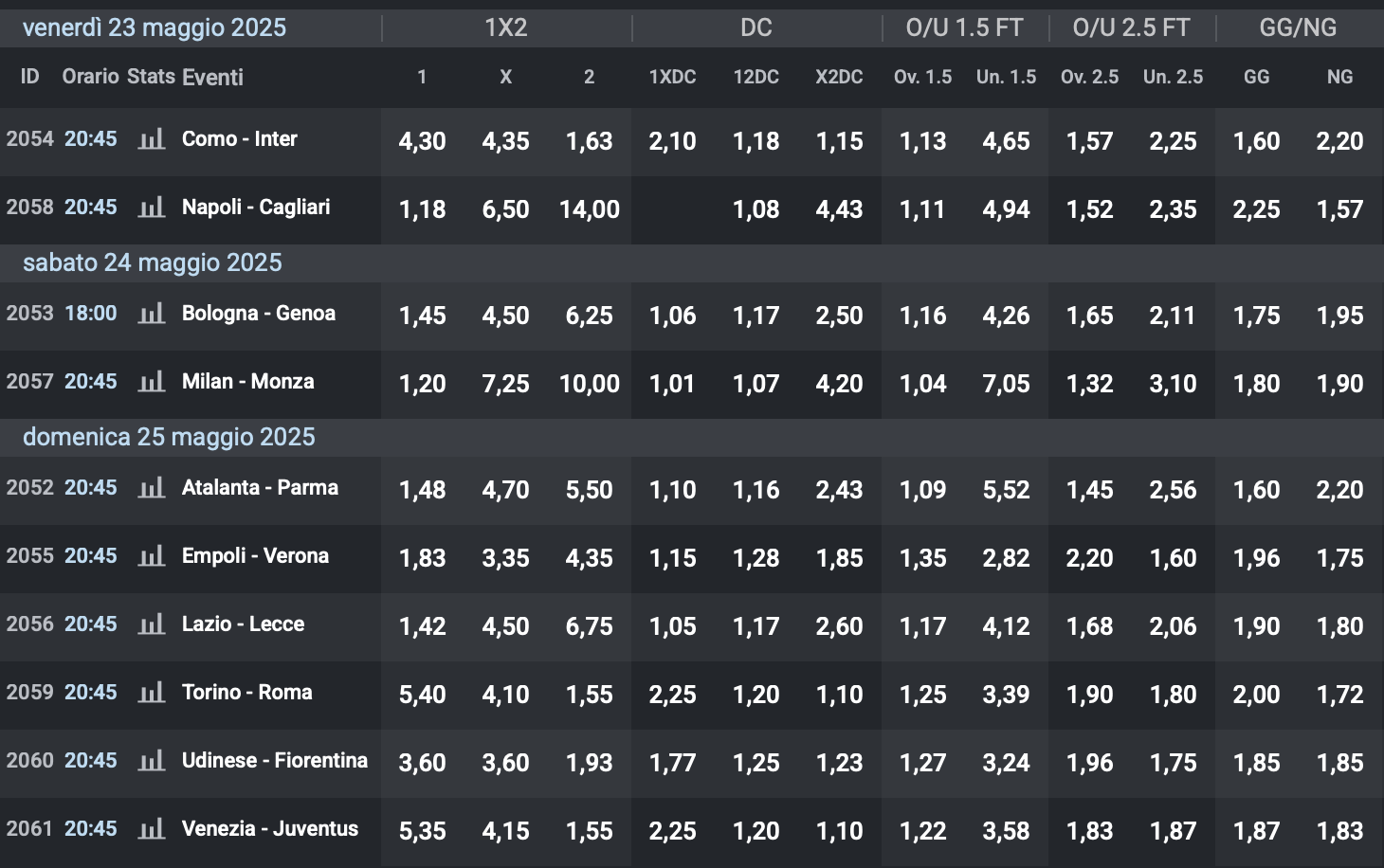 Sabato altri due match con Bologna-Genoa e Milan-Monza, le due squadre lombarde deluse da questa stagione, una fuori dalle coppe, l’altra che tornerà in Serie B. Domenica il resto delle partite, tutte in campo alle ore 20:45 di sera. Tra le sfide più interessanti ci sono Torino-Roma e Venezia-Juventus, con giallorossi e bianconeri che si giocano la top-4 per il piazzamento Champions, entrambe in trasferta, entrambe favorite @1.55 di quota ed entrambe appoggiate dal 60% delle prime scommesse 1X2.