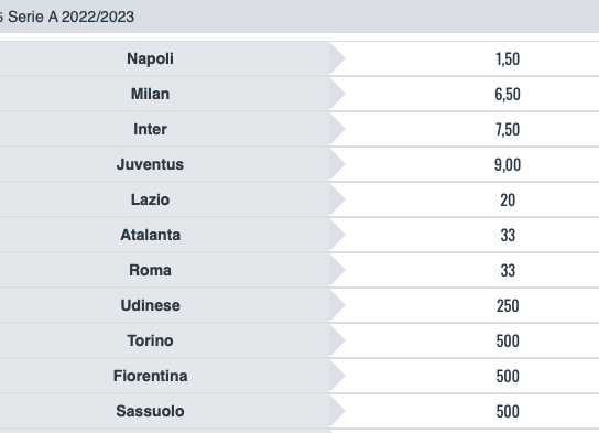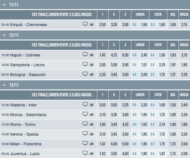 Delicatissimo il momento della squadra di Gasperini, che rischia di scivolare fuori dalle posizioni che contano: la scossa da tre punti si gioca @2,99 (con il 32% delle preferenze), mentre un altro pareggio dopo i due della scorsa stagione pagherebbe @3,55.